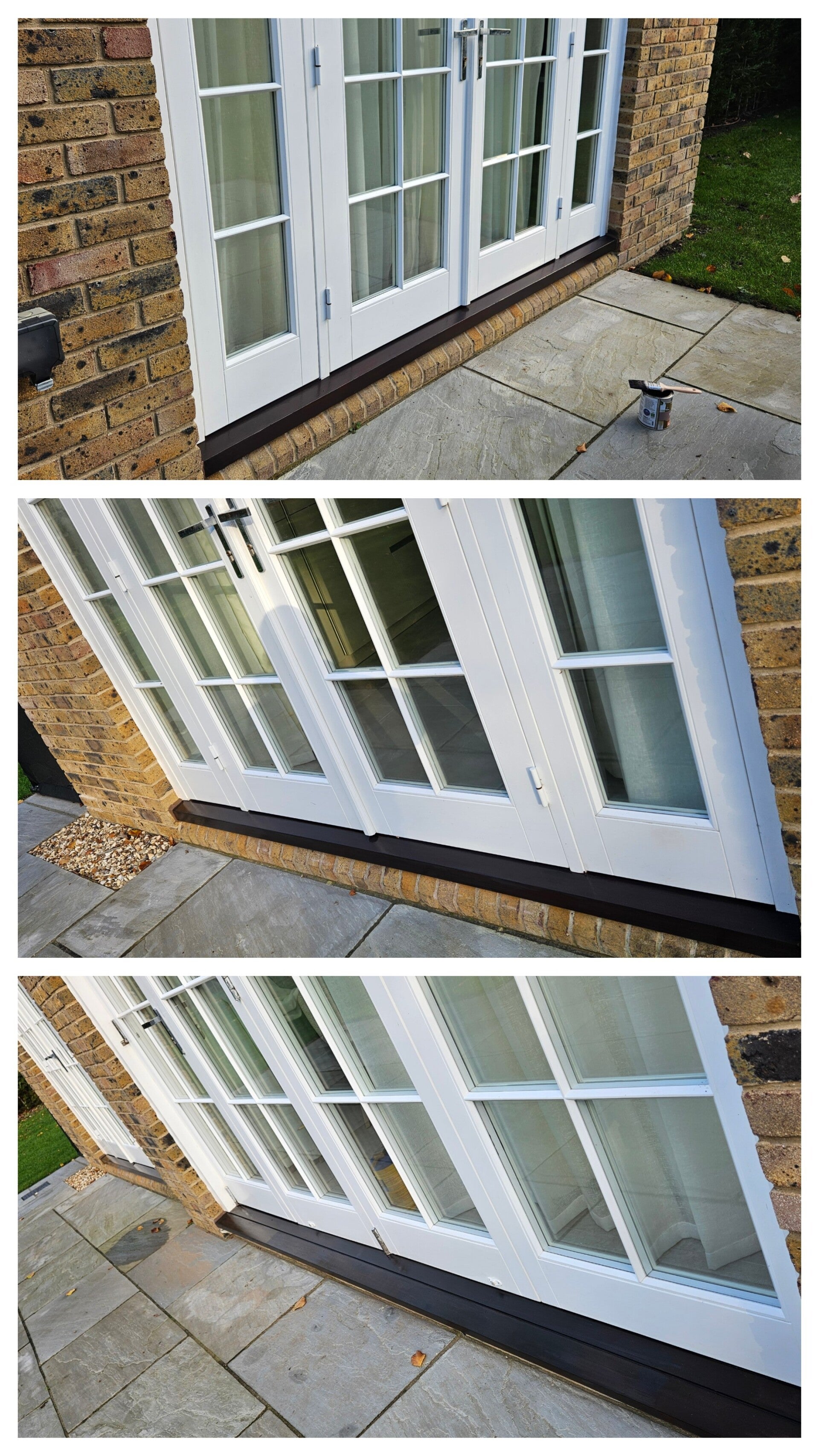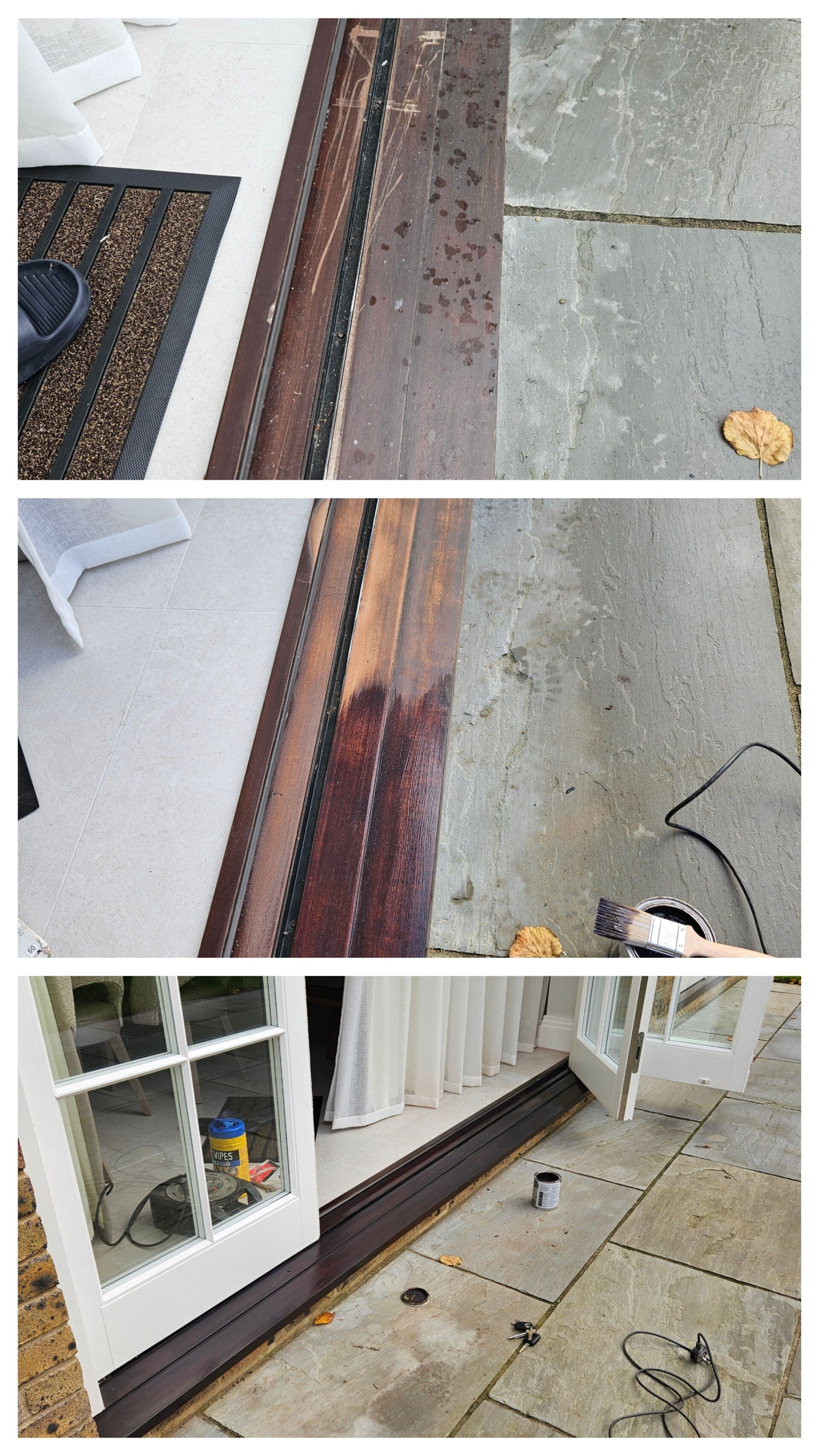 Before: This is what a badly worn and weathered bi-folding patio door threshold looks like. Constant exposure to the elements had degraded the original stain and protective finish, leaving it looking tired and uninviting. Our skilled team came in to resolve this issue.