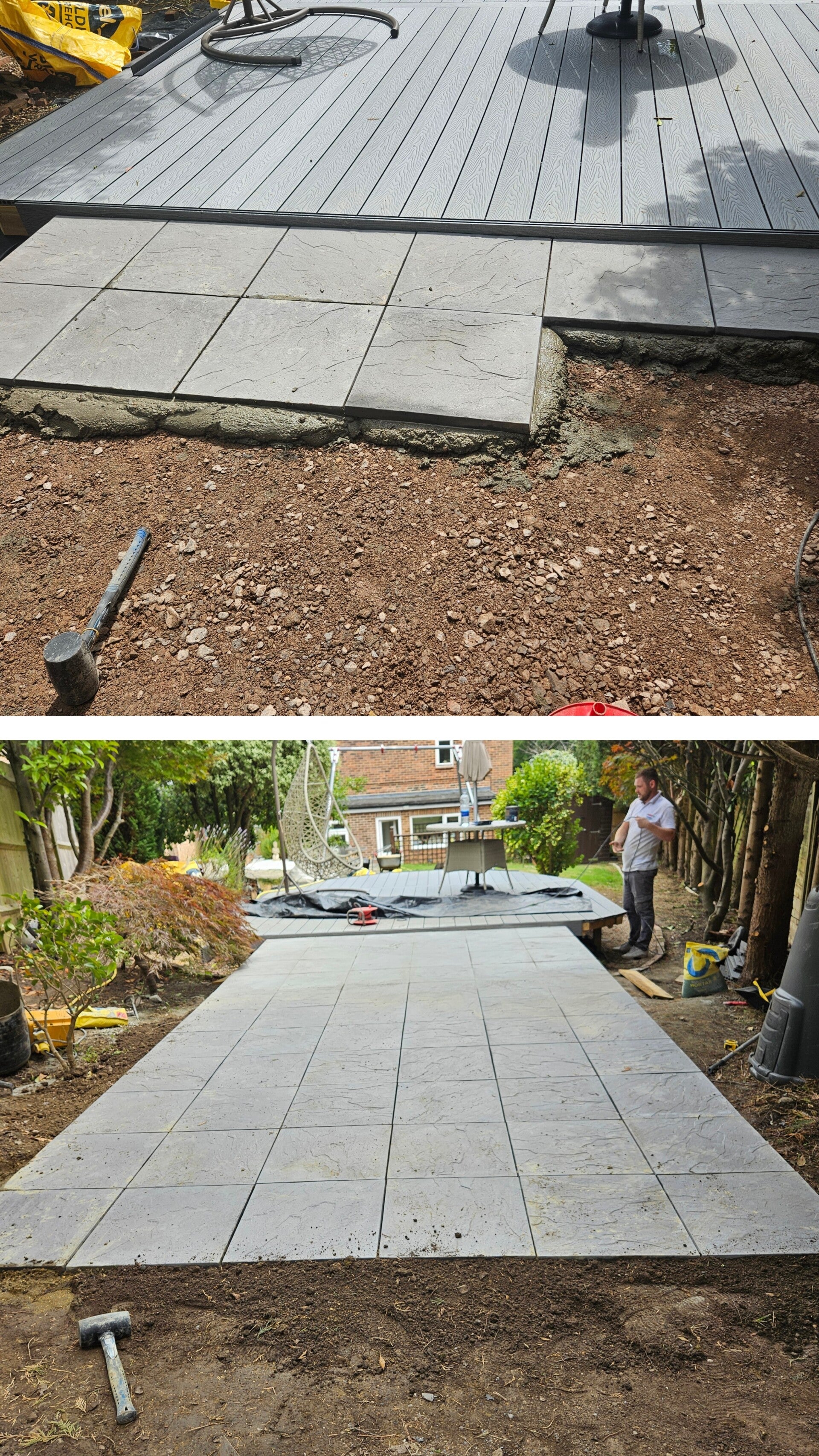 After: The finished patio! Our professional team created a stunning new outdoor living space, perfect for relaxation and entertaining. The paving was laid with precision and care, creating a durable and visually appealing area that the customer will enjoy for years to come. We are proud of our ability to deliver top-quality workmanship, and our customers agree.